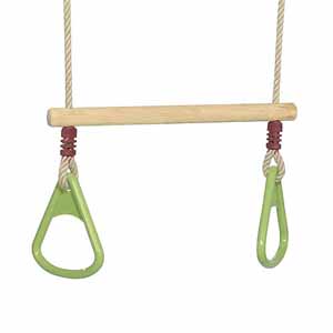 A bright and fun children's trapeze, with highly durable green plastic hand holds, wooden bar for non slip play and strong, soft, weather-resistant rope. Hard-wearing plastic joints and galvanised metal parts ensure years of fun as your child grows. Suitable from 3 years of age, up to a maximum weight of 70kg.